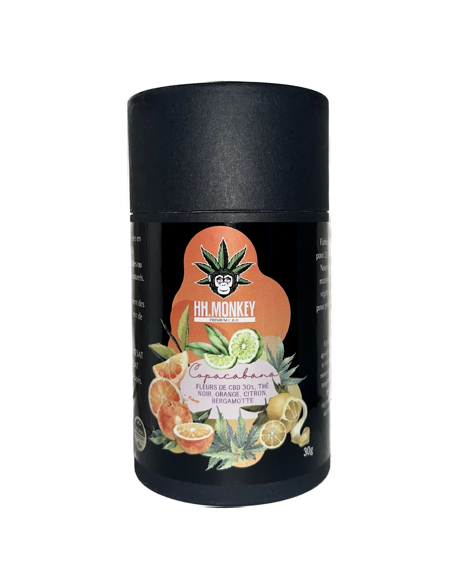 Composition : Morceaux de fleurs et feuilles de cannabis sativa L. CBD (30%), thé noir, arôme orange, arôme citron, bergamote, écorce d’orange, écorce de citron