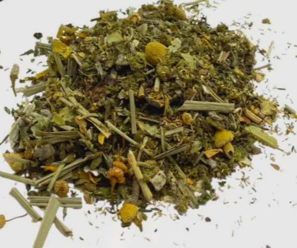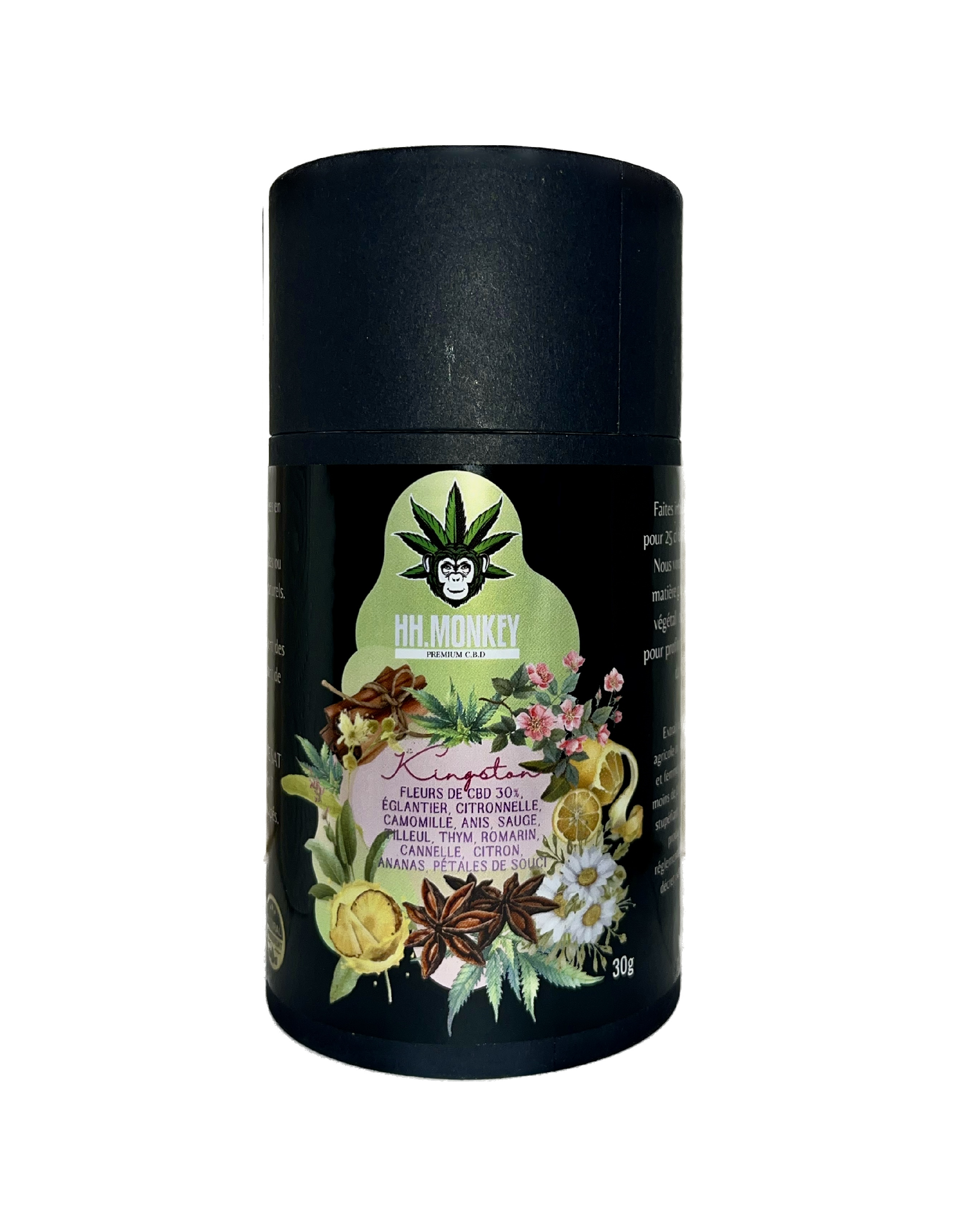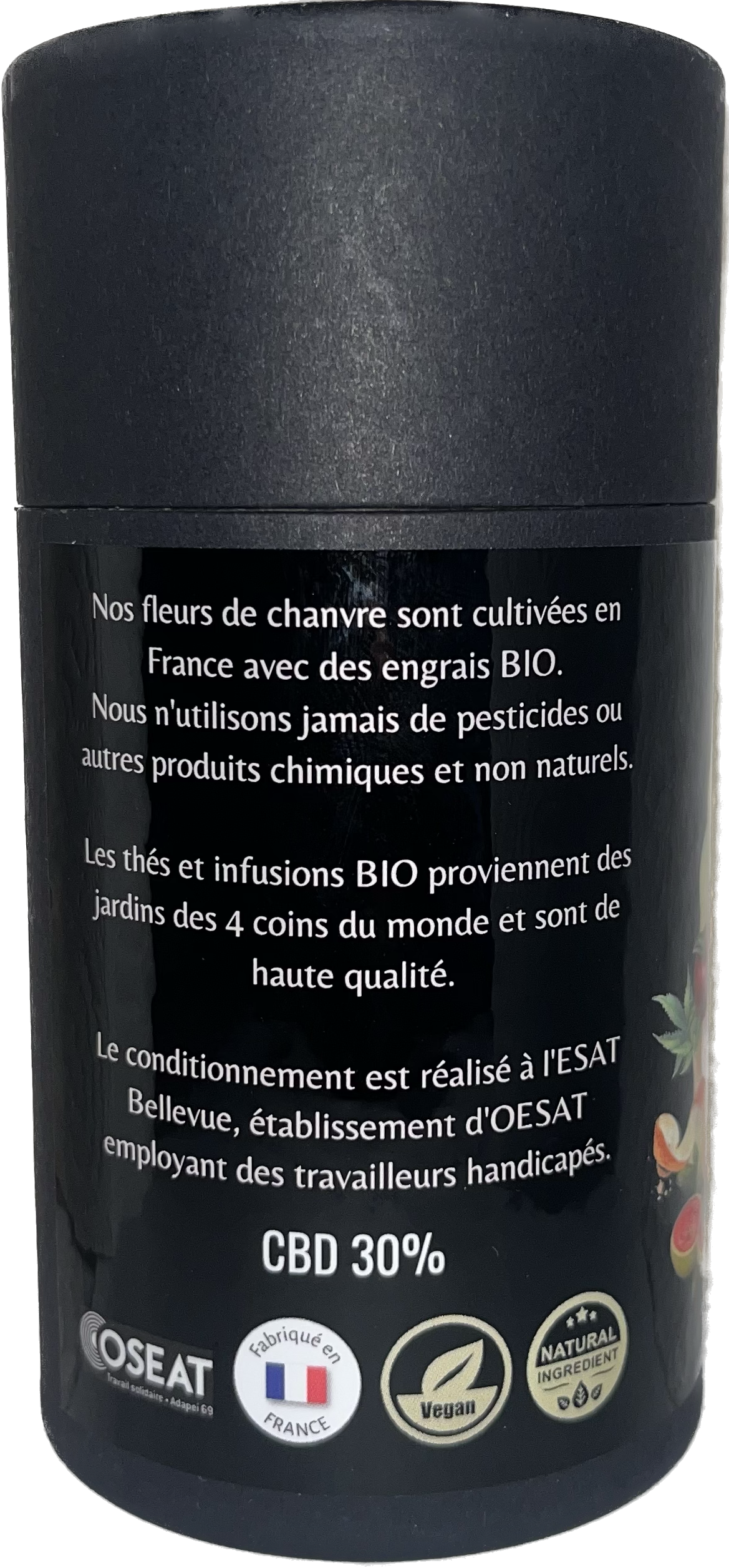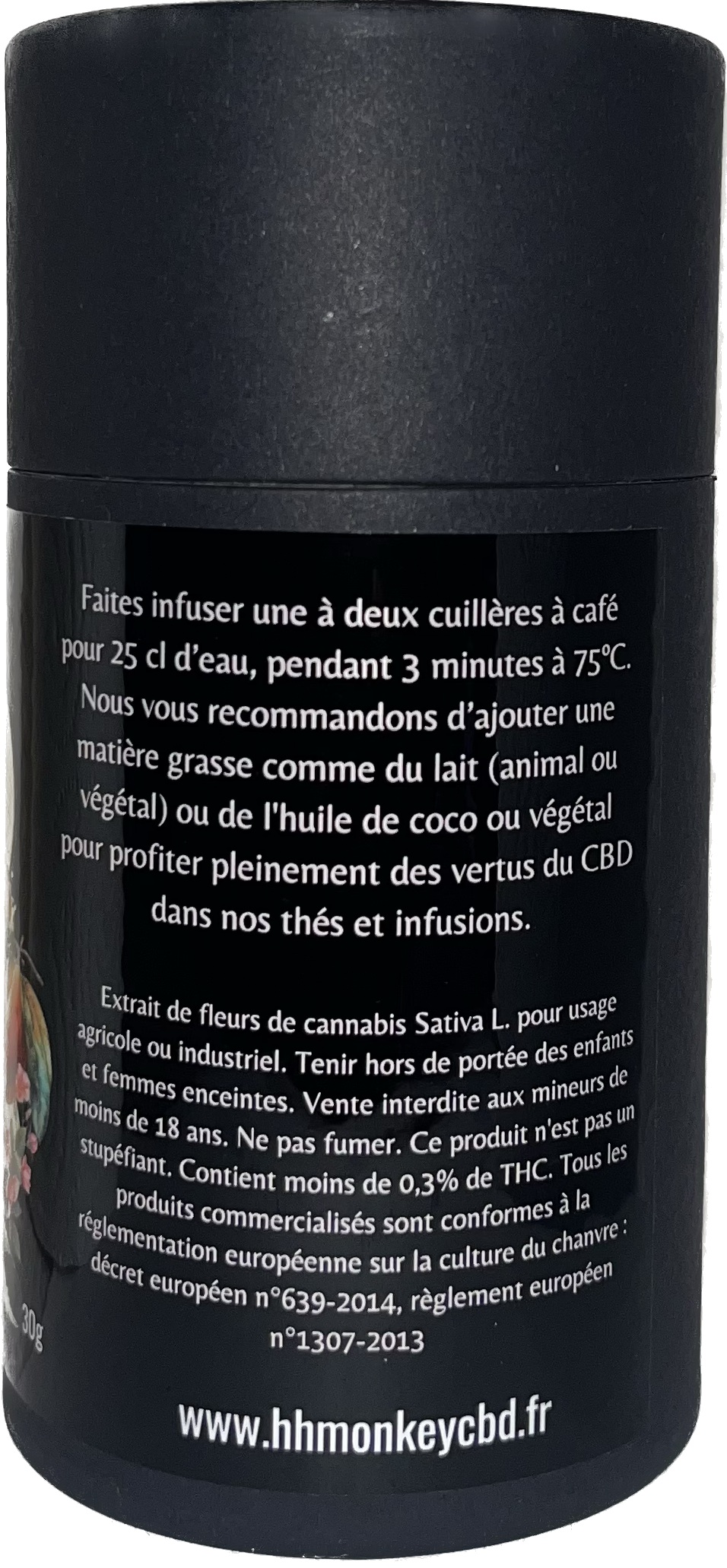 Composition : Morceaux de fleurs et feuilles de cannabis sativa L. CBD (30%), infusion bio églantier, citronnelle, camomille, anis, sauge, tilleul, thym, romarin, cannelle, arôme de citron et ananas, pétales de souci